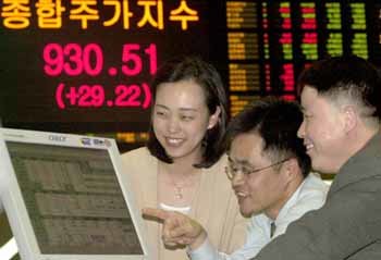 「こんな日が続いて欲しい」。17日、総合株価指数は前日より29.22ポイント上昇し、930ポイント台を突破した。2年2ヵ月ぶりの記録。投資家は、このような動きだと、近い将来1000ポイント台を突破するだろうと期待している。ソウル汝矣島(ヨイドの)証券取引所職員が、株式相場を見ながら微笑んでいる。