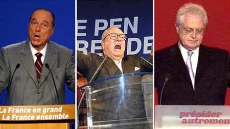 21日投票が行われたフランス大統領選挙で、極右のルペン党首が2位となり、衝撃に包まれた。集計の結果、1位のシラク大統領(左)と2位のルペン党首(真ん中)とも次の決戦投票で自らの勝利に自信を示している。これに対して3位にとどまったジョスパン首相は、政界引退を宣言している。