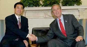 中国の次期国家主席として有力視されている胡錦濤副主席(左側)が1日、ワシントンのホワイトハウスでブッシュ米大統領と会い握手を交している。胡副主席は、チェニー副大統領、ラムズフェルド国防長官、パウエル国務長官とも会談し、通商、人権、台湾問題、米中軍事関係などについて話し合った。