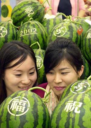 新世界デパート・ソウル江南(カンナム)店は、両親の日を控えて3日、福(福を受けてください)祝(おめでとうございます)壽(長生きしてください)という漢字を刻みこんだ「長寿を祈る」スイカを販売している。