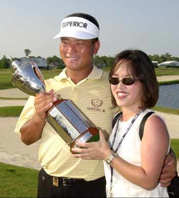 「ありがとう」崔京周(チェ・ギョンジュ)が今まで内助を惜しまなかった妻のキム・ヒョンジョンさんとともに優勝トロフィーを持ち上げて笑顔を浮かべている。