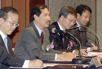 KT(旧韓国通信)経営陣が7日午前、ソウルヒルトンホテルで、政府持ち株売却計画を発表した。左側からナム・チュンス財務室長、イ・サンチョル社長、メン・スホ民営化推進団長、シン・ビョンゴン広報室長。