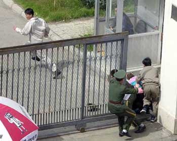 チャン・キルス君の親戚5人が8日、中国瀋陽の日本総領事館に駆け込んだ時、中国の警察官が総領事館の入口で、女性を外に連れ出そうとしている。