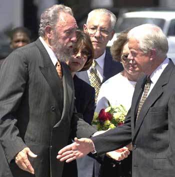 カーター元米大統領(右)が12日、キューバのハバナ空港に到着し、カストロ国家評議会議長と握手するため手を伸ばしている。米国の大統領経験者がキューバを訪問したのは、1959年のキューバ革命以来初めてのことだ。