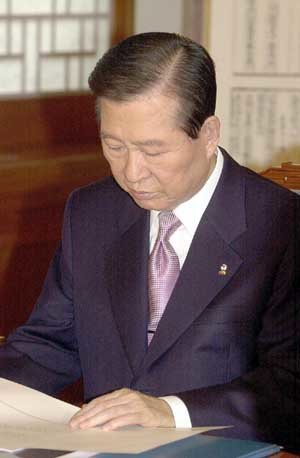 金大中大統領が13日午後、腐敗防止委員会の2002年度業務報告を受け、書類を検討している。