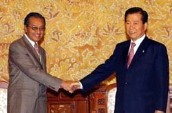 金大中(キム・デジュン)大統領が23日、大統領府(青瓦台)で、マレーシアのマハティール首相との首脳会談を行うのに先立って、握手を交わしている。