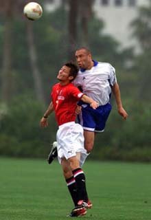韓国入りに先立ち、鹿児島県指宿市でキャンプ中のフランスは22日、Jリーグ浦和との親善試合でアンリ、ジダンら主戦力抜きでも、軽くウォーミングアップをするかのように5対1と大勝し、優勝候補らしい爆発的攻撃力をみせつけた。ベテランのユリ・ジョルカエフ(34)は、ハットトリックを見せ、新鋭シセ(21)も1ゴールを入れ、勢いづいた。