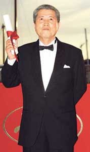 韓国映画史上初めて、カンヌ映画祭で監督賞を受けた林権澤(イム・グォンテク)監督が27日午前(韓国時間)授賞式場で監督賞認証書を見せながら微笑んでいる。