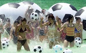 京畿道龍仁市(キョンギド、ヨンインシ)にあるエバーランドのキャラビアンベイの波のプールが、来月1日に今年のオープンをする。オープン前の28日、若い男女職員らが、韓国のサッカー国家代表チームのW杯16強入りを祈願して、直径2mの超大型サッカーボールとビーチボールで遊んでいる。
