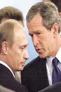 ブッシュ米大統領(右)が28日、イタリア・ローマ郊外の空軍基地で開かれた「北大西洋条約機構(NATO)—ロシア」拡大首脳会談でロシアのプーチン大統領に話しかけている。