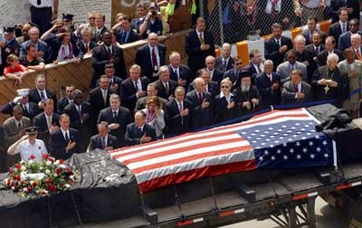 去年9月11日の同時多発テロで全壊した米国ニューヨークの世界貿易センターの最後の残がいである鉄製ビームを取り払う記念式典が、30日、ジョージ・パタキ・ニューヨーク州知事(前列左から二人目)らが出席して行われた。これによって、8ヵ月半も続いた残がい除去作業が全て完了した。前列左3人目からブルムバーグ・ニューヨーク市長、ジュリアニ前市長、シューマー米上院議員、ヒラリー・クリントン上院議員。
