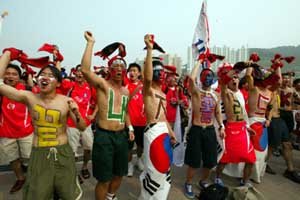 ソウル広津区九宜洞(クァンジング・クイドン)にあるテクノマート。社員たちが3日、ビルの広場で、韓国サッカー代表チームの監督と選手たちのキャラクターに扮して「シュート、ゴールイン8強」と書かれたタテヨコ8mの餅を用意し、客とともに韓国チームの善戦を祈願するイベントを繰り広げている。