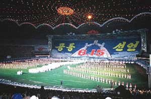 朝鮮民主主義人民居和国(北朝鮮)が現在、平壌(ピョンヤン)の5.1競技場で披露したマスゲーム「アリラン」カードセクションのなかで2000年の6・15南北共同宣言を紹介している。6・15宣言が、アリランのカードセクション場面に含まれていることが写真で確認されたのは初めて。