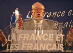 フランスの極右派、国民戦線(FN)を率いるルペン党首が9日、パリ郊外にある党本部で支持者たちにフランス総選挙の第1回投票の出口調査結果について語る途中、騒々しくなると手ぶりで静かにするよう求めている。