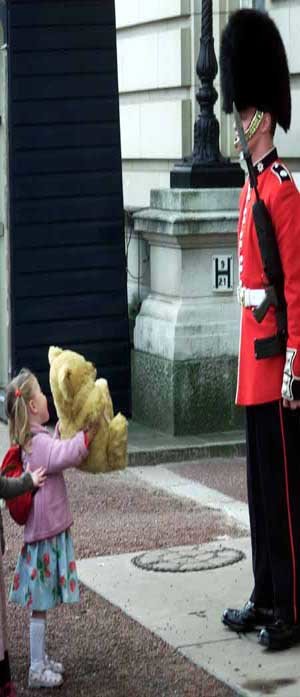 10日、英国ロンドンの募金活動に参加した3才の女の子が、バッキンガム宮殿前で勤務にあたっている近衛兵に、手に持っていた熊の人形を渡そうとしている。
