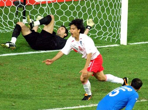 韓国がW杯3回優勝に輝く強豪イタリアを延長戦まで持ち込む接戦の末、延長後半12分、安貞煥の劇的なゴールデンゴールで2−1でサヨナラ勝ちし、W杯初の8強に進出する偉業を達成した。