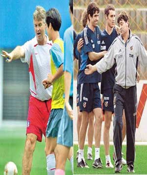 ワールドカップ4強入りをかけた一戦を控えている韓国とスペインの監督が、記者会見を通じて神経戦を繰り広げながらも、選手たちに秘策を植え込むため余念がない。戦術練習を指揮している韓国のフース・ヒディンク監督(左)と、選手たちに囲まれユニークなジェスチャーを見せるスペインのホセ・アントニオ・カマチョ監督。