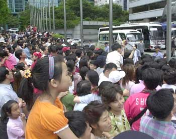 「顔だけでも見せて」23日、韓国サッカー代表の宿舎、ソウル江南(カンナム)のホテル前に駆けつけた市民が、選手たちが現れるのを待っている。