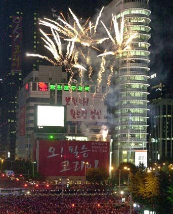 「よく戦った」闘魂を燃やして、最後までグラウンドを駆け巡った韓国代表選手たちの善戦をねぎらう花火が、ソウル鍾路区(チョンログ)の世宗路(セジョンロ)交差点の東亜(トンア)日報社屋にかかっている電光板向こうの夜空に打ち上げられている。