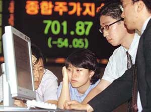 株価が暴落した26日、ソウル汝矣島(ヨイド)の証券取引所の職員たちがこわばった表情でコンピューター端末に見入っている。同日の総合株価指数は54.05ポイント下がり、今年最安値の701.87となった。