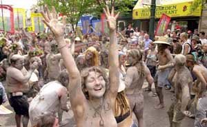 27日、カナダ・カルガリーで主要8カ国(G8)首脳会議に反対するデモ隊が、自然との連帯を強調したパフォーマンスで、全身に泥を塗って踊りながらデモを繰り広げている。