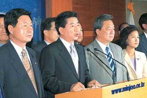 与党民主党の盧武鉉(ノ・ムヒョン)大統領候補(左から2人目)が4日、ソウル汝矣島(ヨイド)の党本部で中立内閣と大統領候補会談を求める記者会見を行っている。