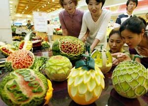 ロッテデパート永登浦(ヨンドゥンポ)店は、スイカ、メロン、パイナップルなどの果物を使った手工芸品を展示する「アート果物彫刻展」を5日まで開く。主婦たちが珍しそうに見ている。