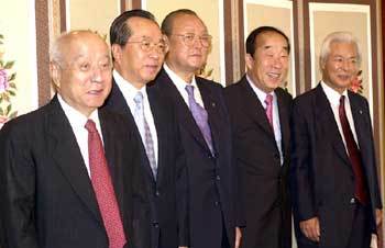 経済5団体の首脳たちが9日、ソウルのロッテホテルで会合し、W杯以降の産業現場で不法ストが拡がる動きが出ているとして、政府の厳重な対処を求めた。左から金珏中(キム・ガクチュン)全国経済人連合会会長、金在哲(キム・ジェチョル)貿易協会長、金昌星(キム・チャンソン)韓国経営者総協会会長、朴容晟(パク・ヨンソン)大韓商工会議所会頭、金栄洙(キム・ヨンス)中小企業協同組合中央会長。