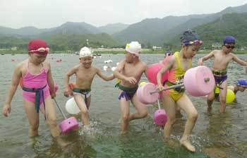 「泳いで渡ったぞ!」11日、京畿道加平(キョンギド・カピョン)の北漢江(プッカンガン)の湖畔渡し場で開かれた「ソウル・子ども漢江を泳いで渡る大会」に参加した幼稚園児童たちが水泳補助具を使って漢江を渡ったあと、陸に上がっている。大会には、幼稚園児童と小学生1200人余りが参加した。