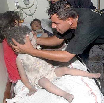 パレスチナの戦士が23日、アル・シャイパ病院で、イスラエルの攻撃で負傷した子どもをゆり起こしている。この日の攻撃で13人のパレスチナ人が死亡し、150人が負傷した。