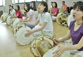 ソウルの小学校教諭50人余りが24日、ソウル江南区浦二洞(カンナムク・ポイドン)の国楽高校で伝統鼓のチャングのけいこを受けている。夏休みを迎えて、チャングや伝統管楽器のタンソなど韓国の伝統音楽の国楽を習ったり、職務研修、コンピューター研修を受ける小学校教師が増えている。