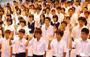 2002在日同胞中高校生の母国夏期学校(7月25日〜8月2日)に参加した在日同胞中高校生150人余りが25日、ソウル鍾路区大学路(チョンログ・テハクロ)の国際教育振興院で入学式を行っている。
