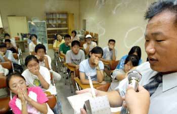 31日、ソウル鍾路区(チョンログ)の保健所で開かれた青少年喫煙教室で、講師がタバコ煙の中のタール成分を見せると、参加者した中学生たちが鼻と口を塞いで驚いた顔をしている。