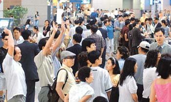 2日、仁川(インチョン)国際空港の出国審査カウンターの前に、海外旅行に出る乗客で長い行列が作られている。最近、仁川空港は、夏休みを迎えた旅行客が大挙押し寄せ、出国手続きが遅延し、航空機の出発が遅れる事態が頻発している。