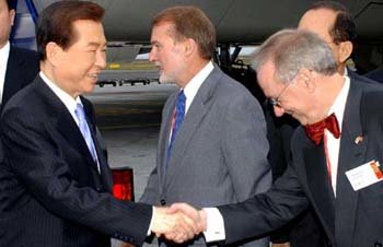 第4回アジア欧州首脳会議出席のため、デンマークを訪れた金大中(キム・デジュン)大統領が22日未明(韓国時間)、カストラップ空港に到着し、オルント・デンマーク儀典長とトンデ駐韓デンマーク大使(右)の出迎えを受けている。