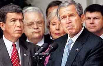 イラク戦争を政治的に利用しているという非難が提起された中で、ブッシュ米大統領が25日ホワイトハウスで、イラク攻撃を支持する共和・民主両党の議員に囲まれて、「イラクへの攻撃について、われわれはまもなく口をそろえるようになる」と話している。