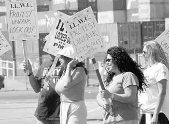 3日(現地時間)、米西部の港湾のひとつであるカリフォルニア州ロングビーチ港で、港湾労働者たちが、米海運協会の職場閉鎖措置に抗議してピケットを持って座り込みを繰り広げている。