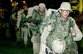 米カリフォルニア基地から選ばれ上陸演習に投入された第11海兵隊派遣部隊の隊員たちが、9日、クウェートに到着した輸送船デンバー号から降りている。今回の演習は、イラクに対する国際社会の武装解除圧力が高まっているなかで行われ注目を集めている。