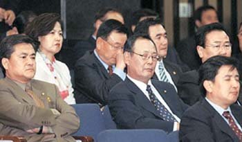 14日、田溶鶴(チョン・ヨンハク)議員の離党を受け、対策を話し合うために召集された与党民主党の議員総会で、議員らが深刻な表情で座っている。