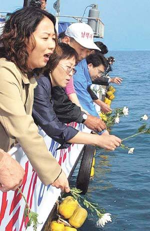 朝鮮民主主義人民共和国(北朝鮮)に拉致された韓国人被害者の家族たちと「拉致人権委員会連帯」のメンバー10人あまりは、16日午前、仁川(インチョン)の無衣(ムウィ)島沖で海上デモを行い、南北閣僚級会談で北朝鮮に拉致された韓国人問題を正式議題に取り上げることを求めた。参加者たちが、拉致被害者486人のうち死亡が確認された20人のめい福を祈って海に菊の花を投げている。