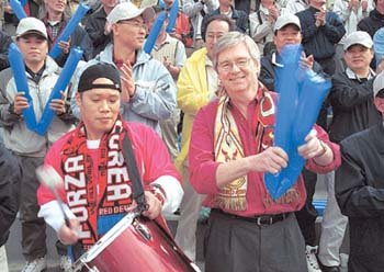 新設法人「GM大宇(テウ)」のスタートを記念するため、19日、仁川文鶴(インチョン・ムンハク)総合競技場で開かれたGM大宇自動車会社の社員サッカー大会。ニック・ライリー社長(右)が太鼓をたたきながら社員たちと一緒に応援している。