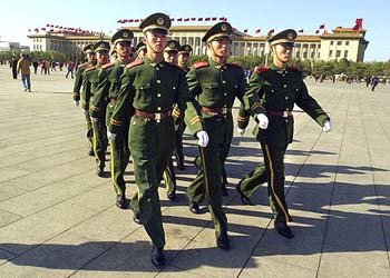 제16차 전국대표대회(16전대)를 앞두고 비상경계령이 내려진 가운데 중국 군인들이 대회장소인 베이징의 인민대회당 앞에서 삼엄한 경계를 펴고 있다.