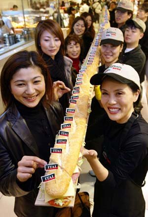 「3mの巨大サンドイッチを味見してください」。ロッテデパートのソウル小公洞(ソゴンドン)本店が10日、開店23周年を記念して作った大きさ3mの巨大なサンドイッチを、来場客と社員たちが持ち上げている。このサンドイッチはお客に無料で提供された。