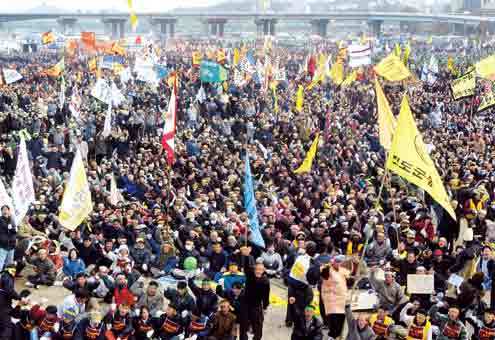 전국에서 집결한 6만여명의 농민들이 13일 서울 여의도 둔치에서 우리 쌀 지키기 전국농민대회를 갖고 쌀 개방 및 한-칠레간 자유무역협정(FTA) 중단을 요구하고 있다.