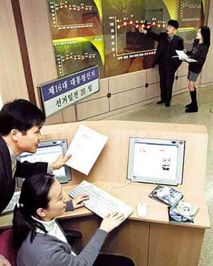 中央選挙管理委員会の職員たちが19日、大統領選関係の各種統計が一目で分かる電子総合選挙状況室で作業に取り組んでいる。