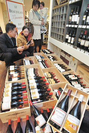 11月の第3木曜日は、フランス・ボージョレヌーボー地方のワイン「ボージョレヌーボ」が全世界で一斉に販売開始される日だ。販売開始を翌日に控えた20日、ソウル狎鴎亭洞(アックジョンドン)の現代(ヒョンデ)デパートを訪れたお客たちが展示されているボージョレヌーボを見ている。