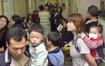 日曜日も病院はインフルエンザの患者たちが殺到して足の踏み場がなかった。24日、ソウル竜山(ヨンサン)区のある小児科病院の廊下で、インフルエンザと思われる子どもと保護者が順番を待っている。