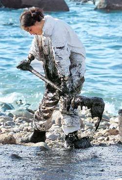 24日、ボランティアメンバーが、スペイン沖で沈没したタンカー「プレステージ号」から流れ出た重油で、汚染されたガリーシア海岸を清掃している。