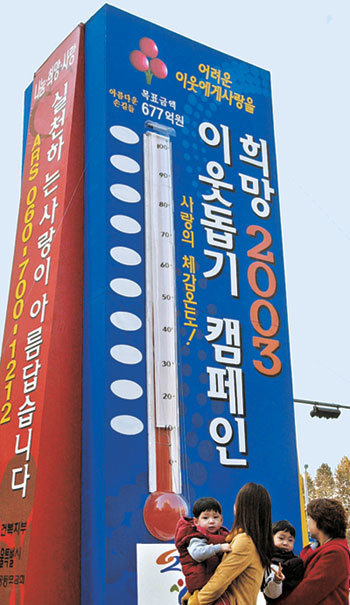 子どもを抱えた主婦たちが1日、ソウル市庁前の広場に立てられた「愛の体感温度塔」を見ている。ソウル市と社会福祉共同募金会が設置した塔は、2日から来年の1月31日まで、恵まれない人たちを助けるための募金が6億7700万ウォン集まるまで、募金が集まるたびに目盛りが1度ずつ上がっていく。目標額(677億ウォン)に達すれば100度になり、目標額を超過すればさらに目盛りが上がる。