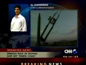 미 CNN방송이 11일 오전(한국시간) 스커드 미사일을 싣고 가던 북한 화물선이 스페인 함정에 나포된 사실을 긴급 방송하고 있다.